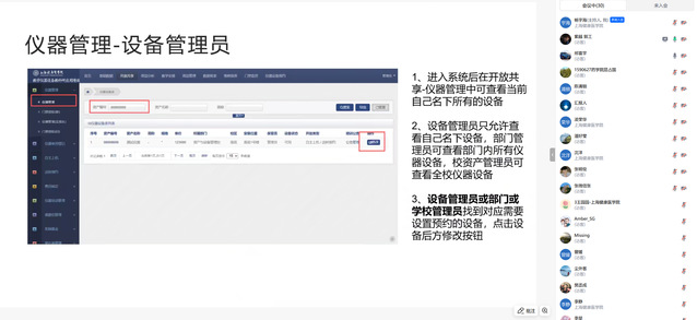 培训环节由系统开发单位紫越网络科技有限公司的工程师主讲。他通过系统演示,详细讲解了设备管理员的权限设置、开放时间安排、收费标准设定等管理功能,以及用户端的仪器检索、预约申请提交等全流程操作演示。
